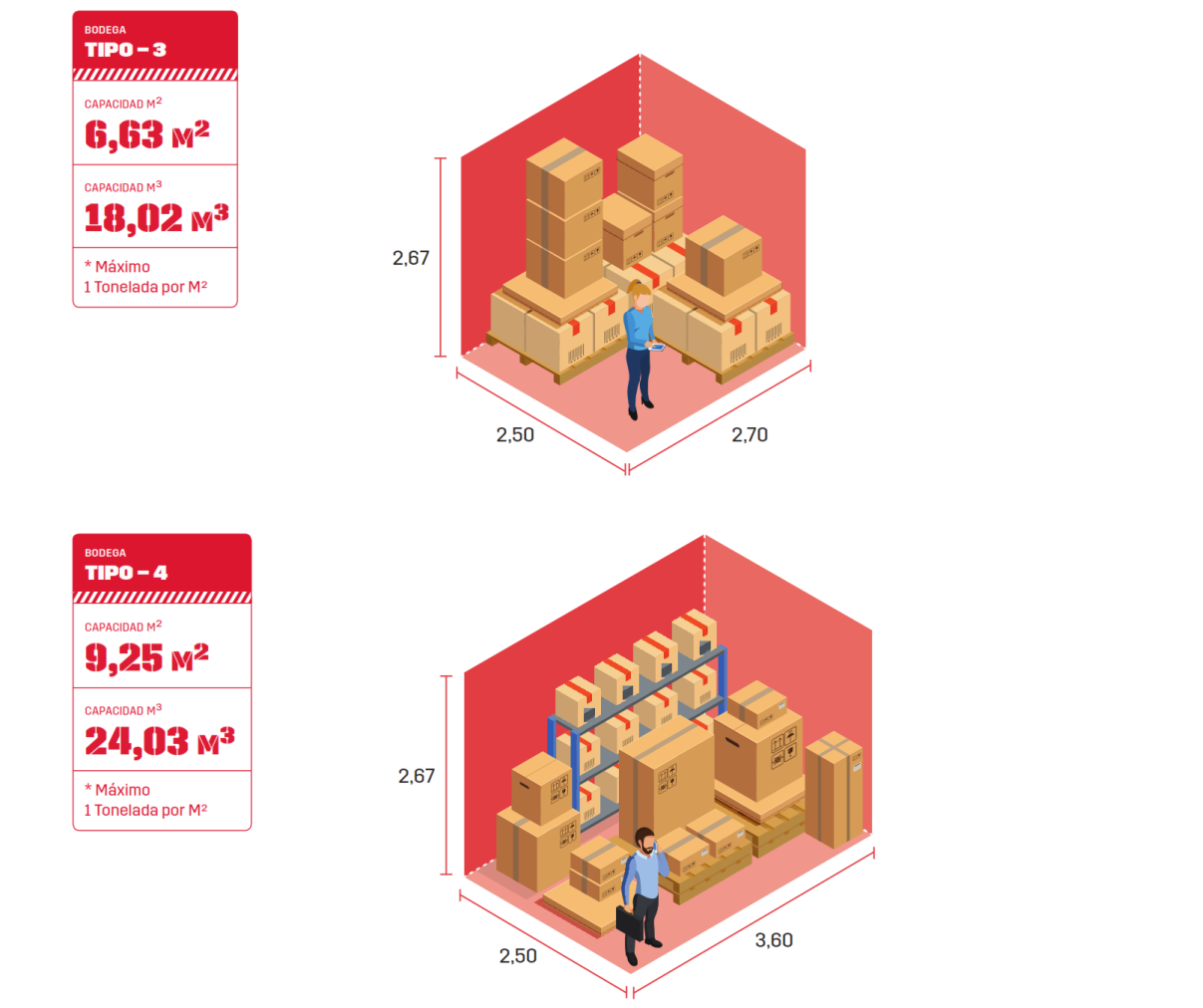 Con el espacio suficiente para movilizar un Palet de 1,2m x 1m y un ascensor con capacidad hasta 2 toneladas de peso.