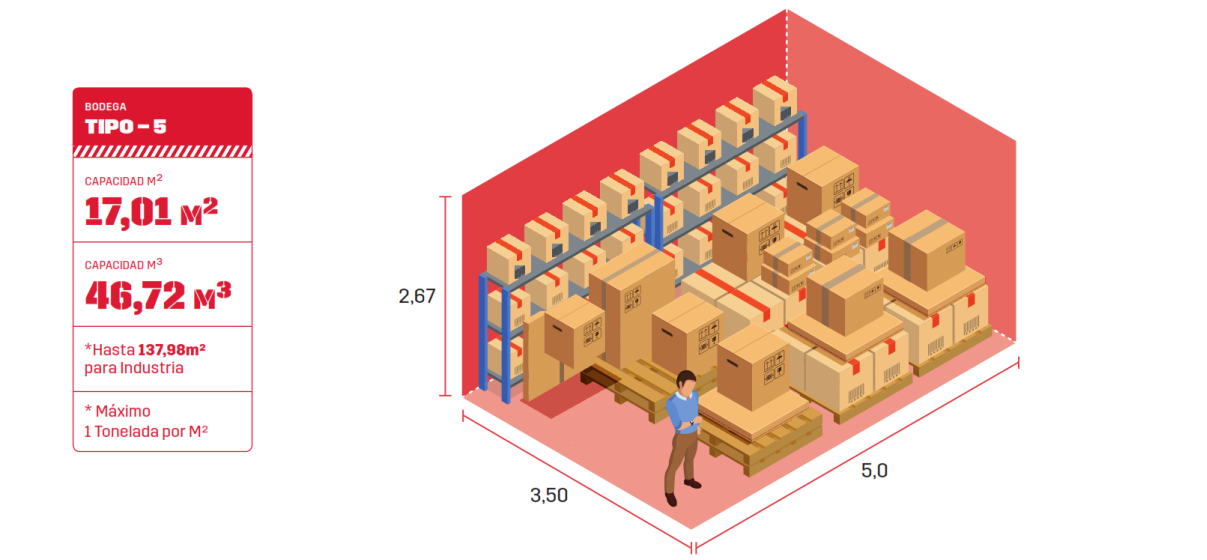 Con amplitud y seguridad de un container, altura de 2.75m y una puerta de acceso de 2,35m x 2,39m.